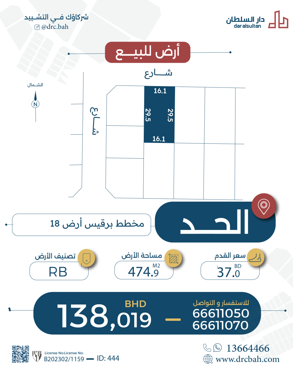 أرض سكنية للبيع في الحد بتصنيف RB (مناطق السكن الخاص (ب)). مساحة أرض 474.9 متر مربع, بسعر 27.00د.ب لكل قدم مربع , السعر الإجمالي 138,019.140د.ب