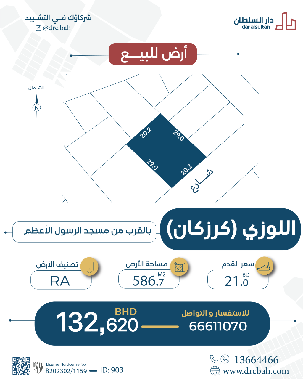 أرض سكنية للبيع في اللوزي بتصنيف RA (مناطق السكن الخاص - أ). مساحة أرض 586.7 متر مربع, بسعر 16.00د.ب لكل قدم مربع , السعر الإجمالي 101,043.840د.ب