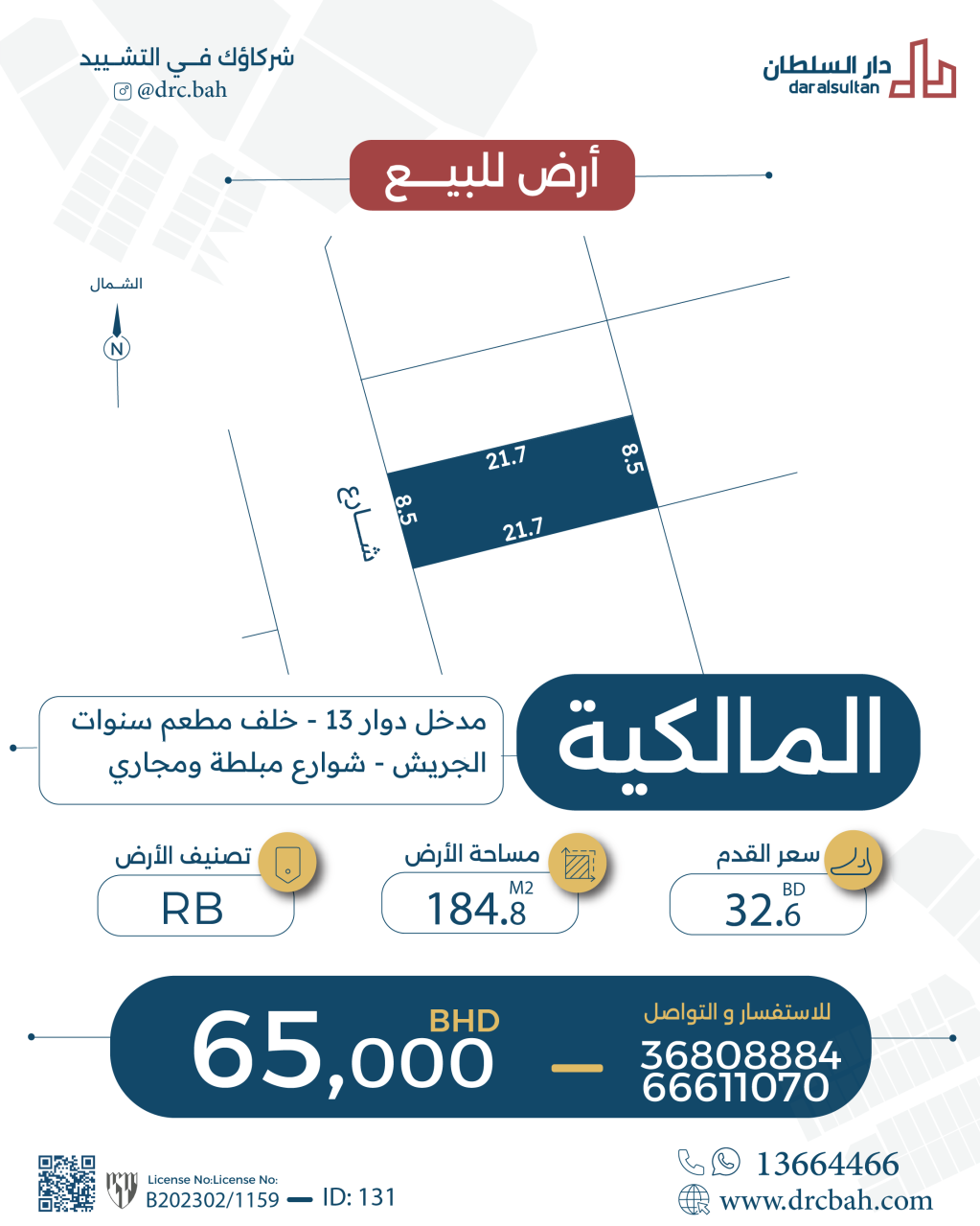 أرض سكنية للبيع في المالكية بتصنيف RB (مناطق السكن الخاص (ب)). مساحة أرض 184.8 متر مربع, بسعر 32.68د.ب لكل قدم مربع , السعر الإجمالي 64,998.772د.ب