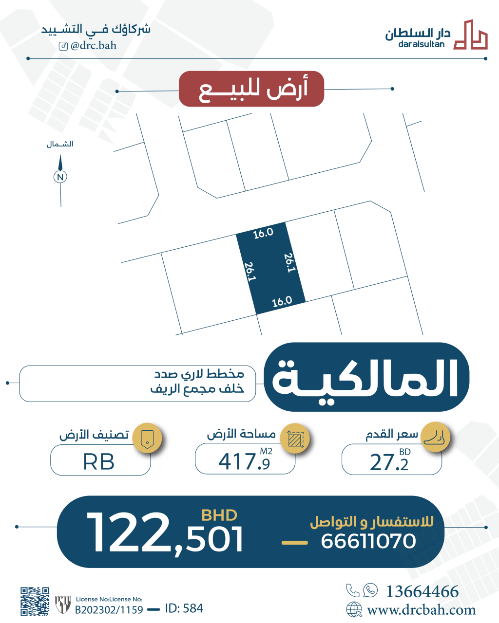 أرض سكنية للبيع في المالكية بتصنيف RB (مناطق السكن الخاص (ب)). مساحة أرض 417.9 متر مربع, بسعر 27.23د.ب لكل قدم مربع , السعر الإجمالي 122,501.659د.ب