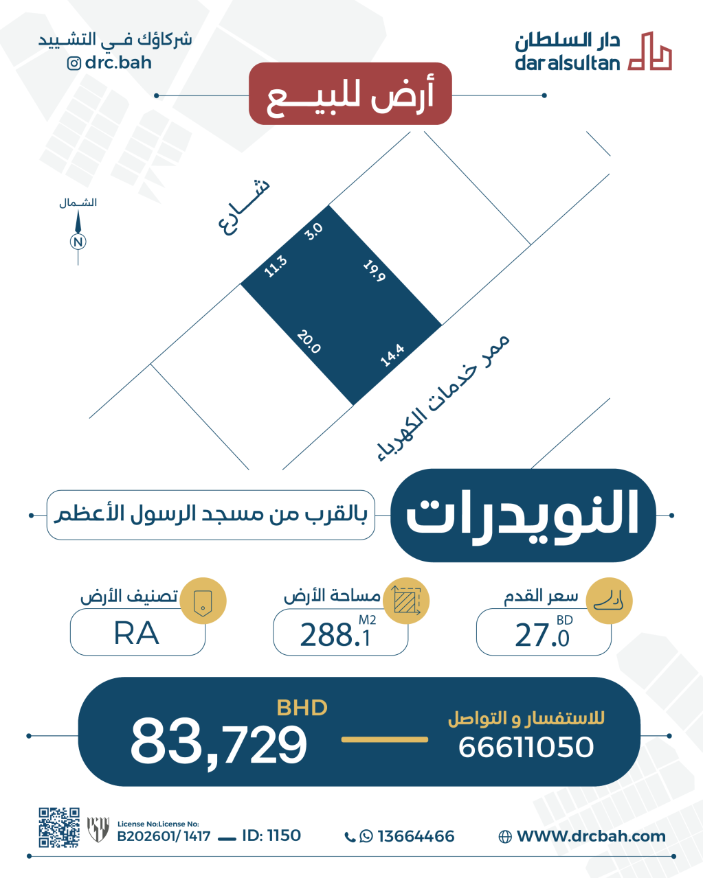 أرض سكنية للبيع في النويدرات بتصنيف RA (مناطق السكن الخاص - أ). مساحة أرض 288.1 متر مربع, بسعر 27.00د.ب لكل قدم مربع , السعر الإجمالي 83,729.970د.ب