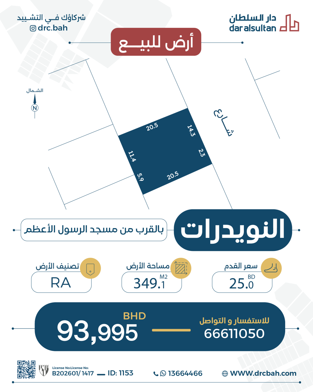 أرض سكنية للبيع في النويدرات بتصنيف RA (مناطق السكن الخاص - أ). مساحة أرض 349.1 متر مربع, بسعر 25.01د.ب لكل قدم مربع , السعر الإجمالي 93,995.358د.ب