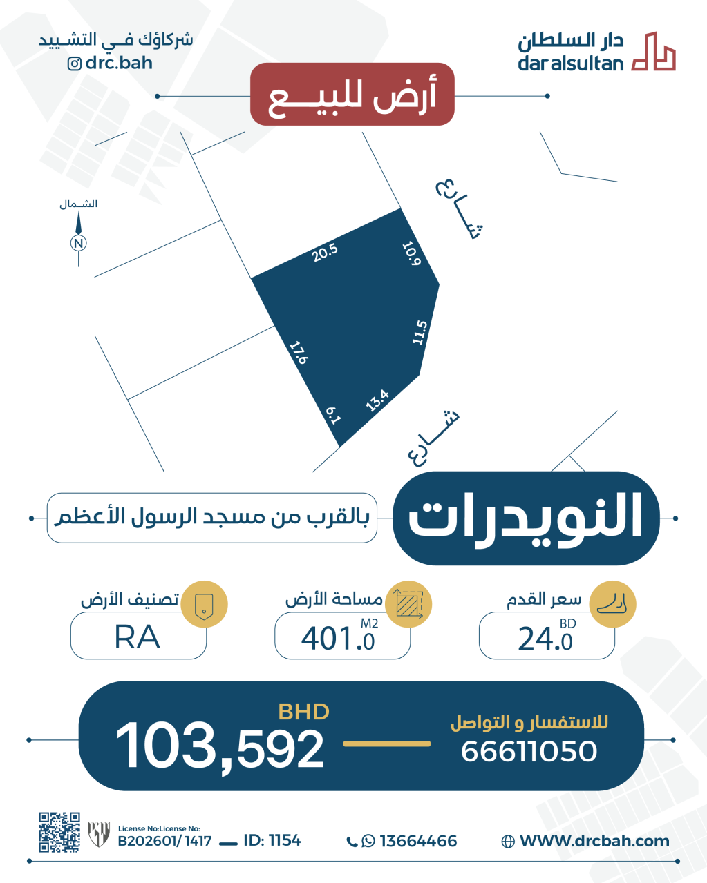 أرض سكنية للبيع في النويدرات بتصنيف RA (مناطق السكن الخاص - أ). مساحة أرض 401 متر مربع, بسعر 24.00د.ب لكل قدم مربع , السعر الإجمالي 103,592.640د.ب