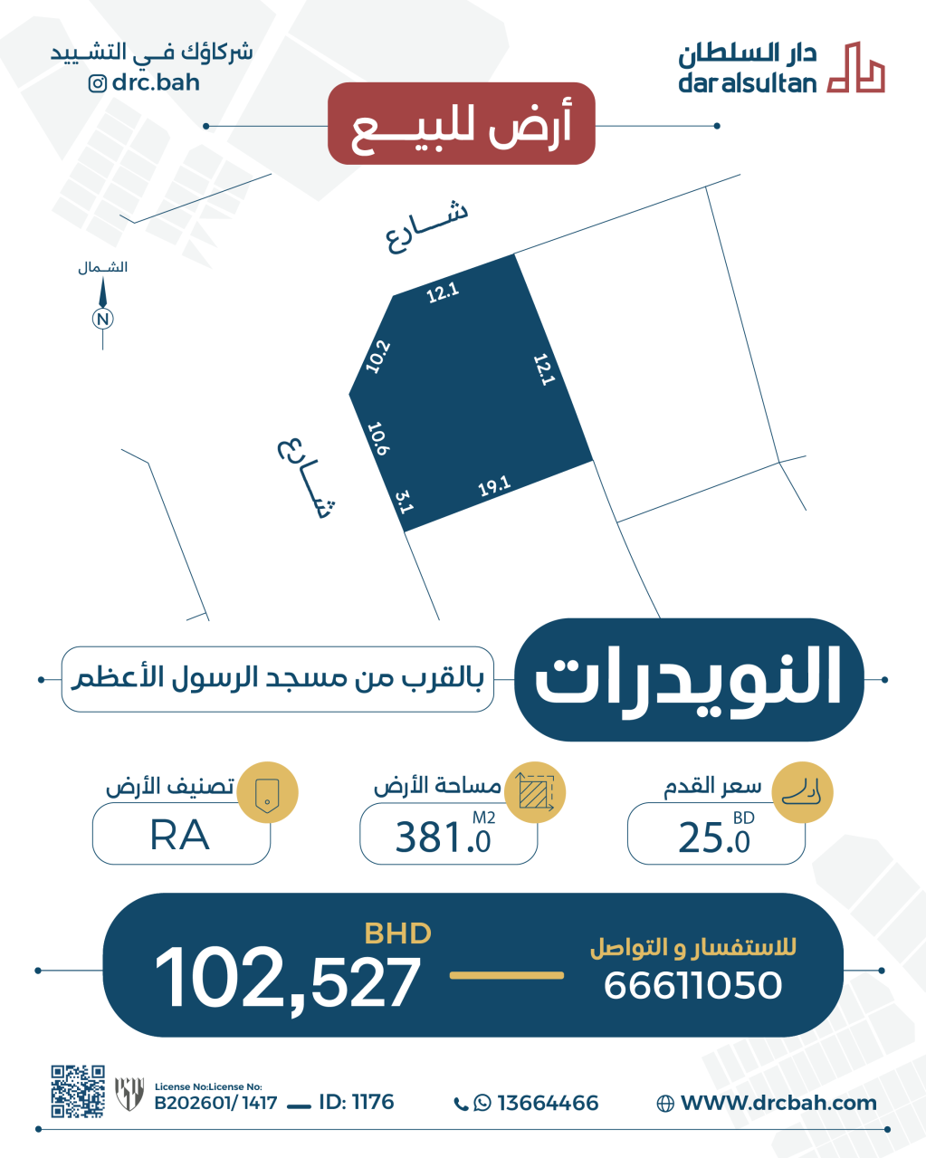 أرض سكنية للبيع في النويدرات بتصنيف RA (مناطق السكن الخاص - أ). مساحة أرض 381 متر مربع, بسعر 25.00د.ب لكل قدم مربع , السعر الإجمالي 102,527.000د.ب