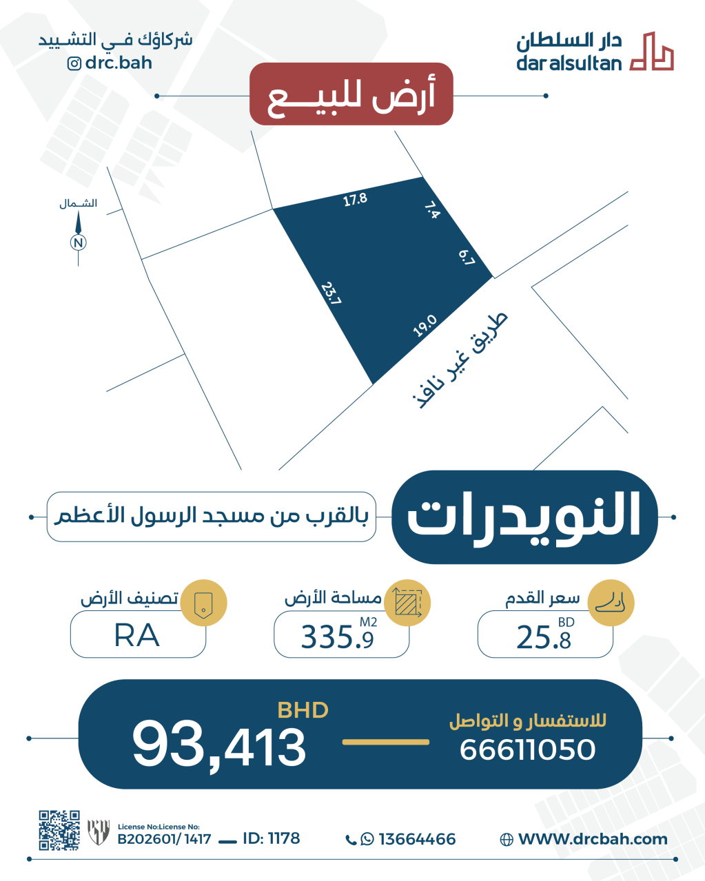 أرض سكنية للبيع في النويدرات بتصنيف RA (مناطق السكن الخاص - أ). مساحة أرض 335.9 متر مربع, بسعر 25.84د.ب لكل قدم مربع , السعر الإجمالي 93,413.417د.ب