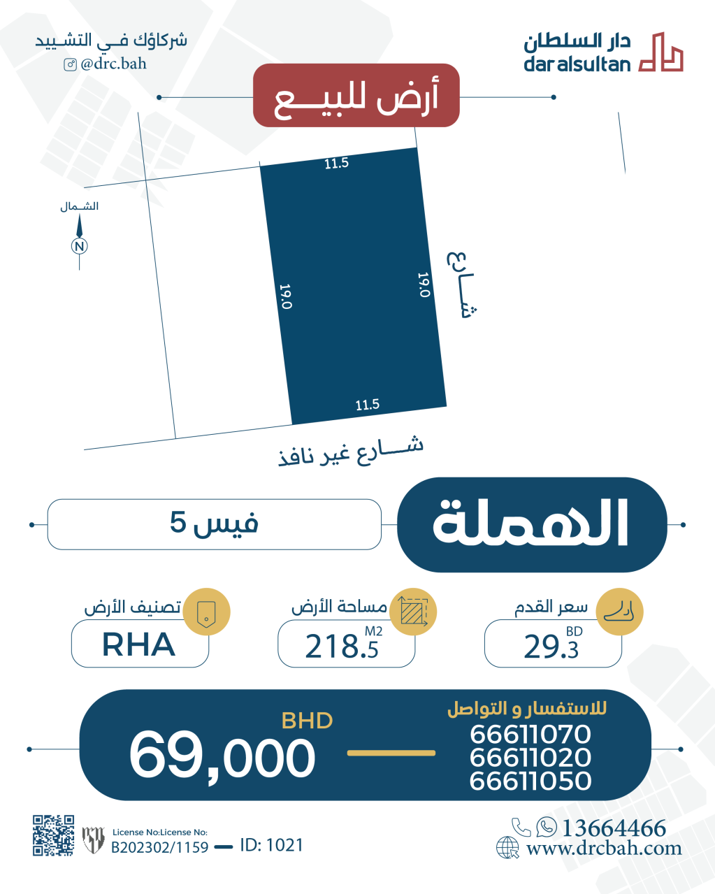 أرض سكنية للبيع في الهملة بتصنيف RHA (مناطق السكن المتصل - أ). مساحة أرض 218.5 متر مربع, بسعر 29.34د.ب لكل قدم مربع , السعر الإجمالي 69,000.922د.ب