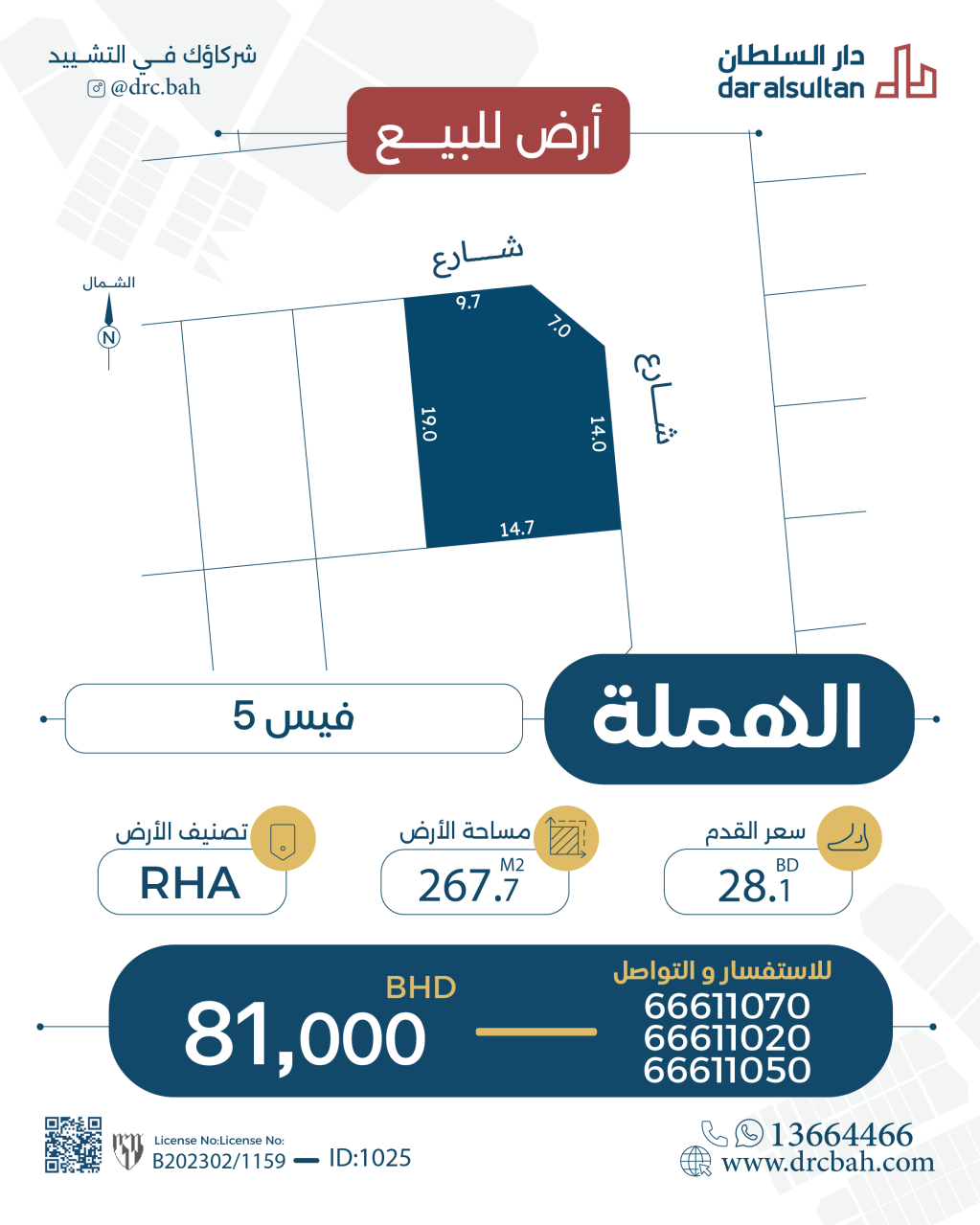 أرض سكنية للبيع في الهملة بتصنيف RHA (مناطق السكن المتصل - أ). مساحة أرض 267.7 متر مربع, بسعر 27.76د.ب لكل قدم مربع , السعر الإجمالي 79,999.640د.ب