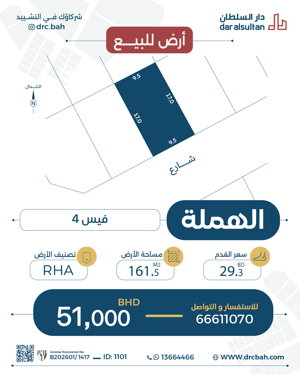 أرض سكنية للبيع في الهملة بتصنيف RHA (مناطق السكن المتصل - أ). مساحة أرض 161.5 متر مربع, بسعر 29.34د.ب لكل قدم مربع , السعر الإجمالي 51,000.886د.ب