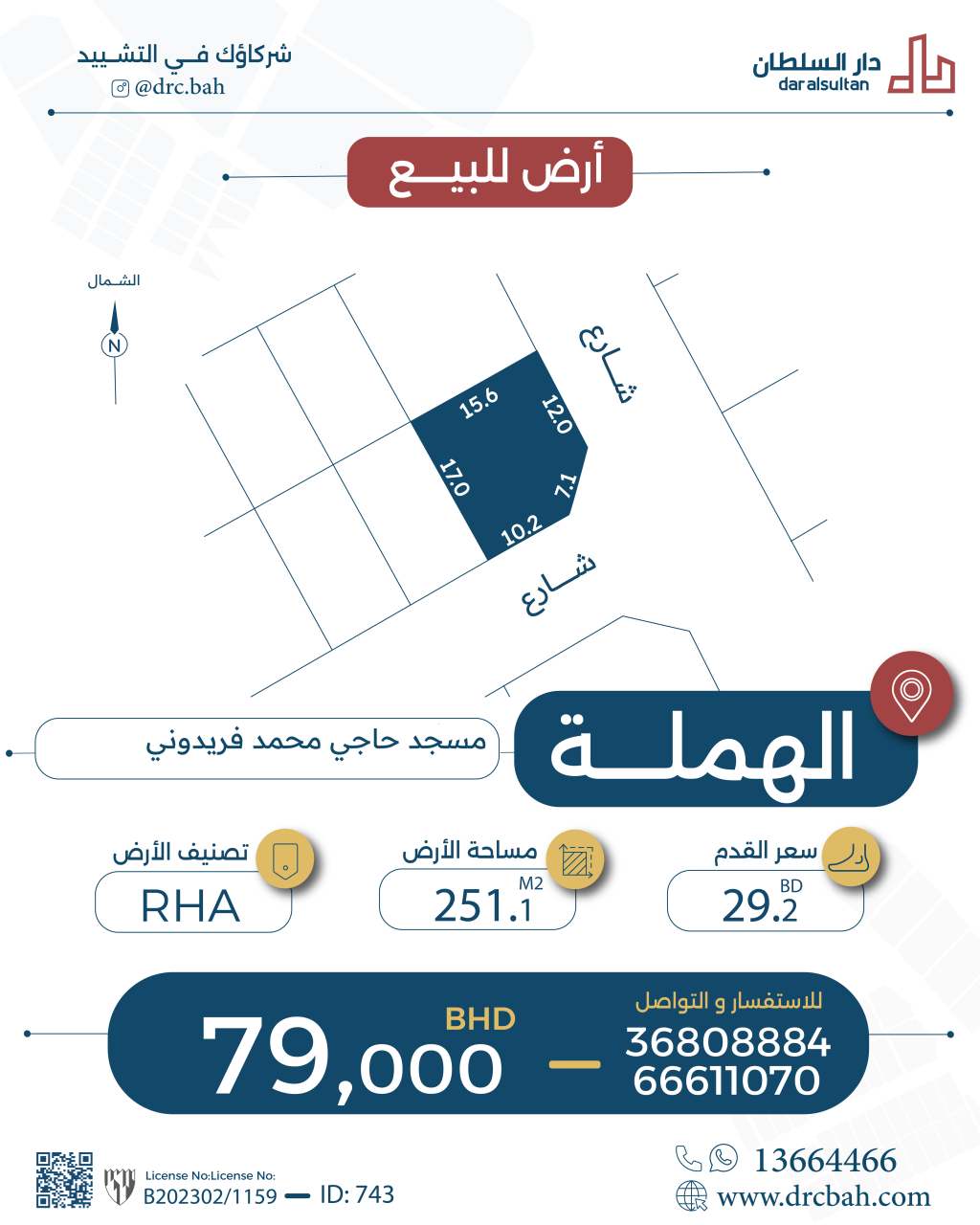 أرض سكنية للبيع في الهملة بتصنيف RHA (مناطق السكن المتصل - أ). مساحة أرض 251.1 متر مربع, بسعر 29.23د.ب لكل قدم مربع , السعر الإجمالي 79,001.310د.ب