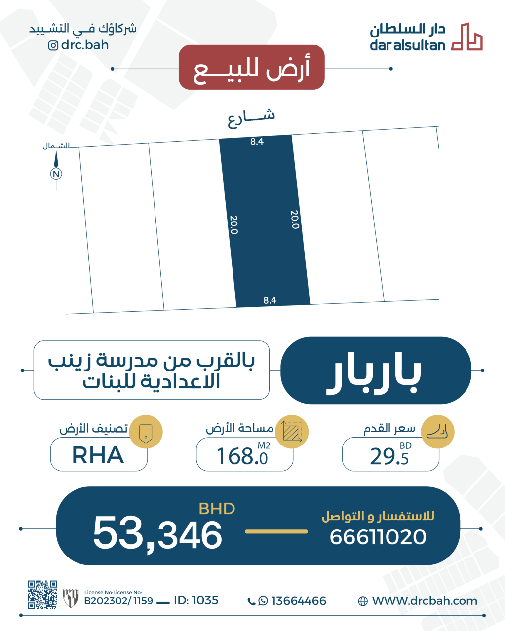 أرض سكنية للبيع في باربار بتصنيف RHA (مناطق السكن المتصل - أ) تقع على شارع واحد. مساحة أرض 168 متر مربع, بسعر 29.50د.ب لكل قدم مربع , السعر الإجمالي 53,346.325د.ب