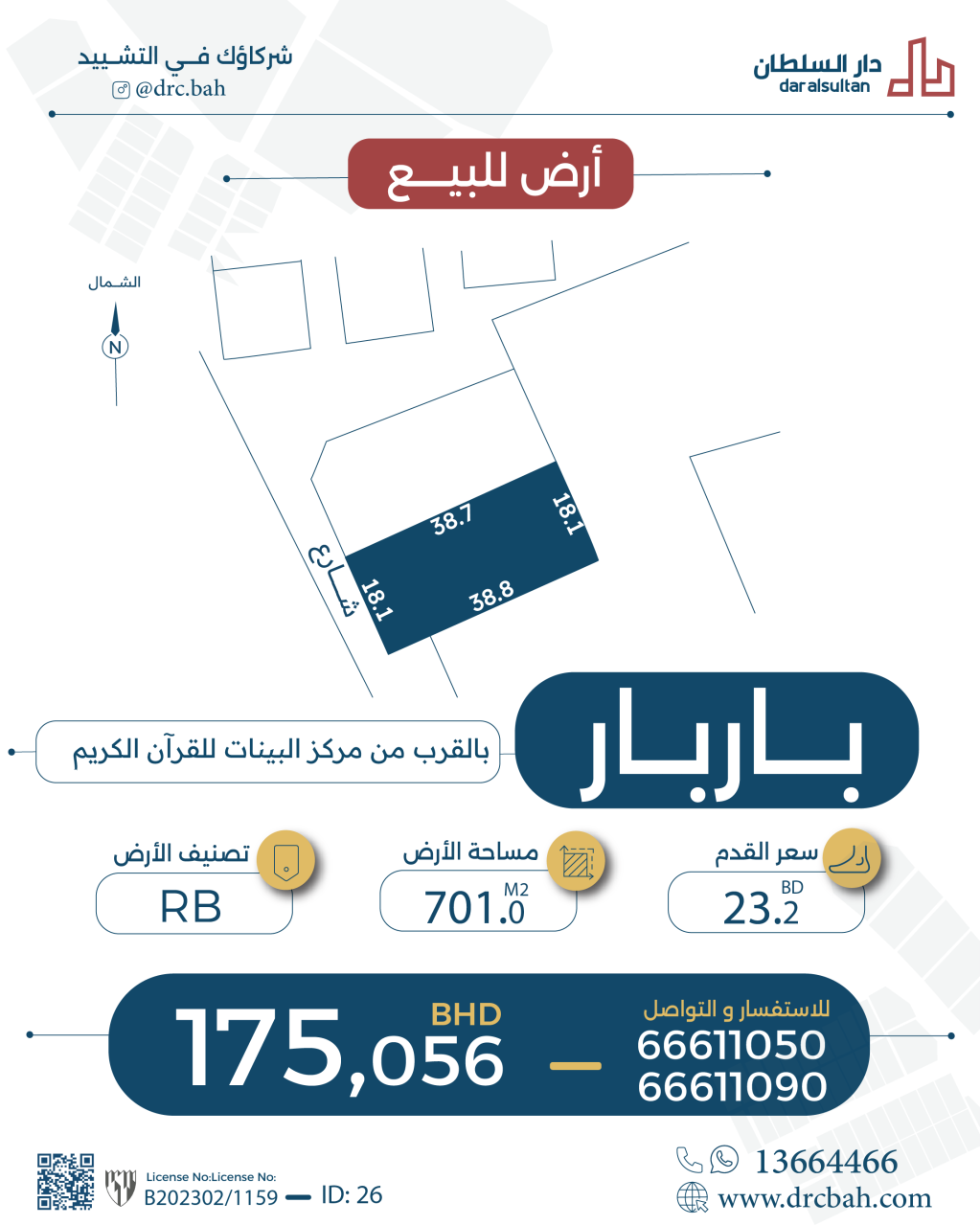 أرض سكنية للبيع في باربار بتصنيف RB (مناطق السكن الخاص (ب)) تقع على شارع واحد. مساحة أرض 701 متر مربع, بسعر 23.20د.ب لكل قدم مربع , السعر الإجمالي 175,056.992د.ب