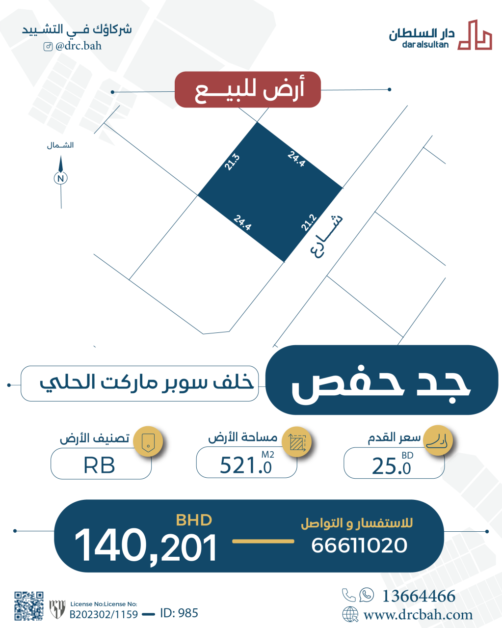 أرض سكنية للبيع في جدحفص بتصنيف RB (مناطق السكن الخاص (ب)). مساحة أرض 521 متر مربع, بسعر 25.00د.ب لكل قدم مربع , السعر الإجمالي 140,201.000د.ب