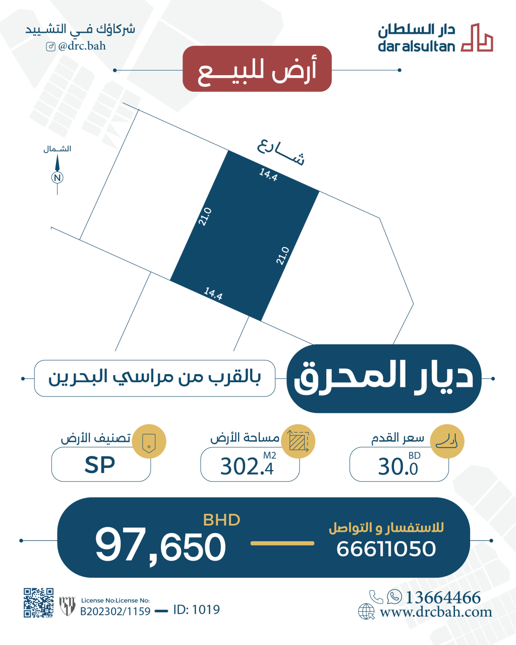 أرض سكنية للبيع في ديار المحرق بتصنيف SP (مناطق المشاريع ذات الطبيعة الخاصة). مساحة أرض 302.4 متر مربع, بسعر 30.00د.ب لكل قدم مربع , السعر الإجمالي 97,650.900د.ب