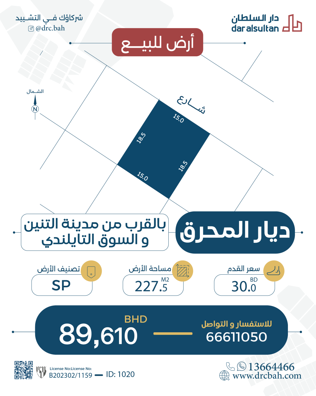 أرض سكنية للبيع في ديار المحرق بتصنيف SP (مناطق المشاريع ذات الطبيعة الخاصة). مساحة أرض 277.5 متر مربع, بسعر 30.00د.ب لكل قدم مربع , السعر الإجمالي 89,610.300د.ب