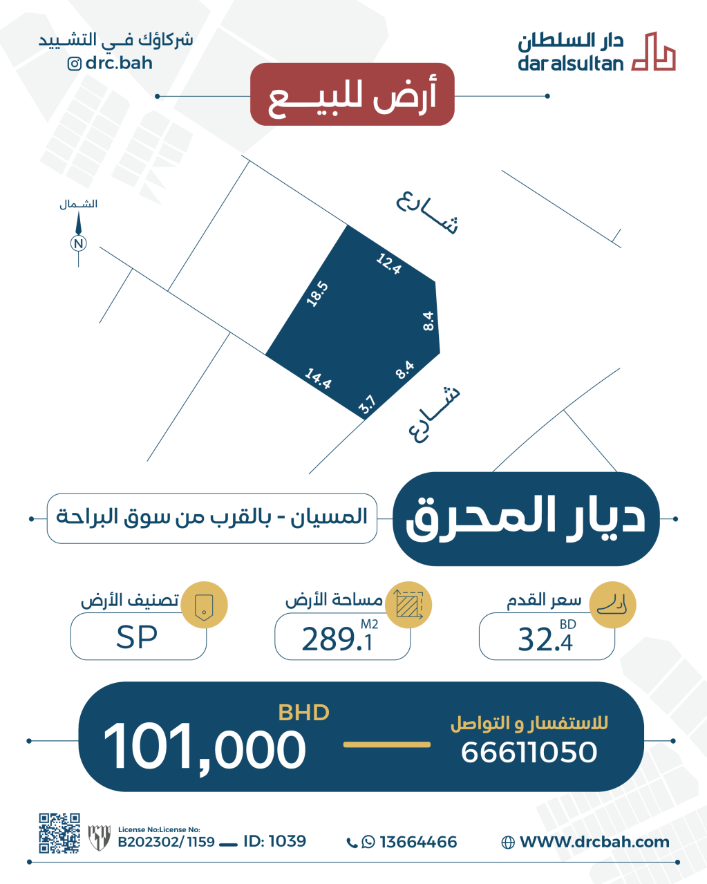 أرض سكنية للبيع في ديار المحرق بتصنيف SP (مناطق المشاريع ذات الطبيعة الخاصة). مساحة أرض 289.1 متر مربع, بسعر 32.46د.ب لكل قدم مربع , السعر الإجمالي 101,001.965د.ب