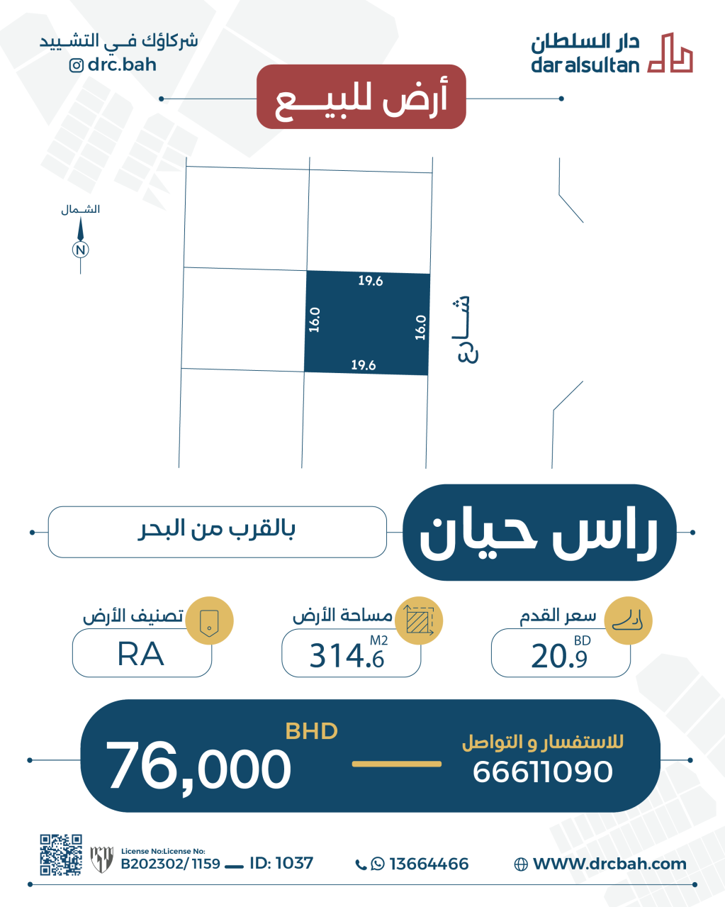 أرض سكنية للبيع في راس حيان بتصنيف RA (مناطق السكن الخاص - أ). مساحة أرض 314.6 متر مربع, بسعر 20.97د.ب لكل قدم مربع , السعر الإجمالي 76,000.000د.ب