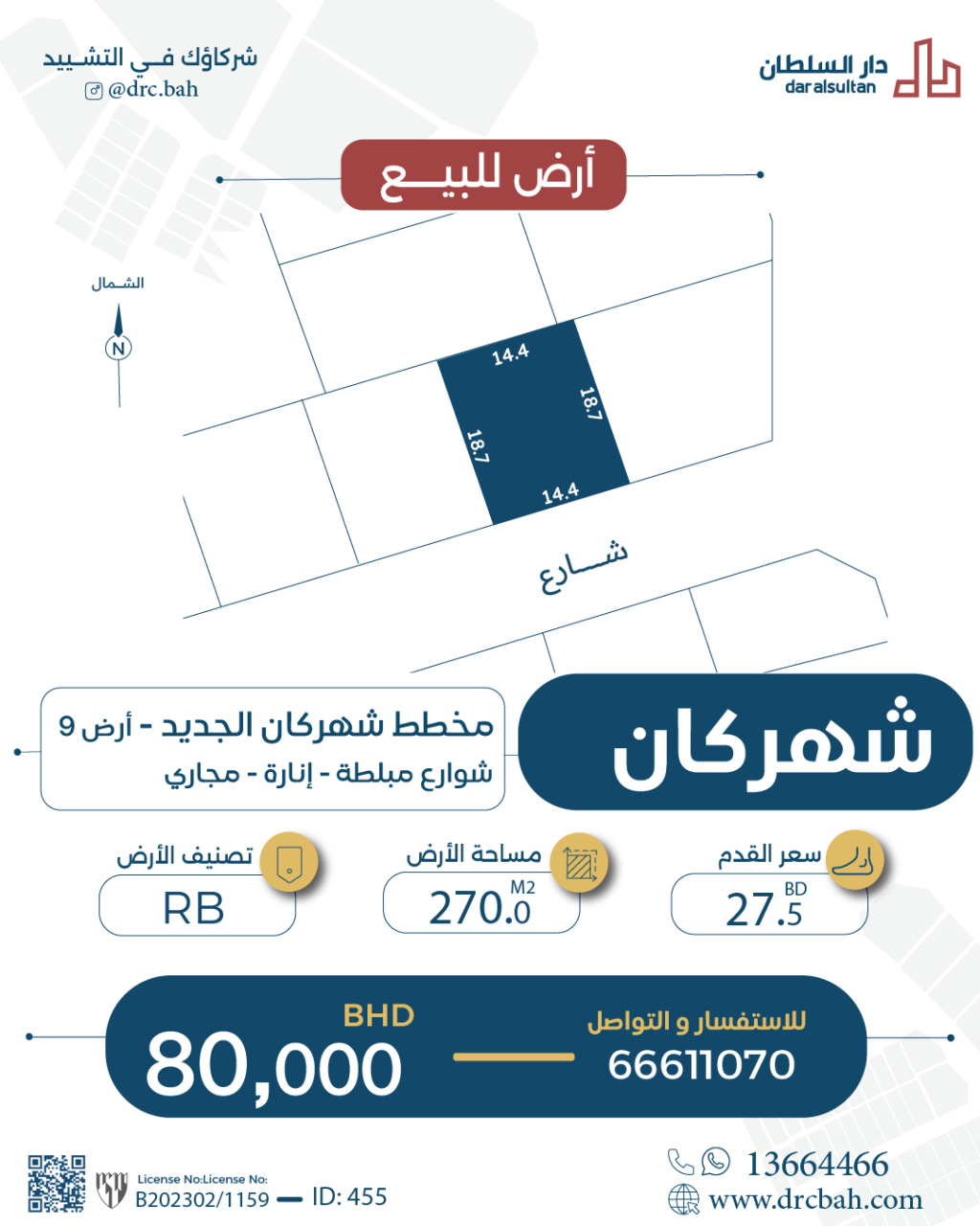 أرض سكنية للبيع في شهركان بتصنيف RB (مناطق السكن الخاص (ب)). مساحة أرض 270 متر مربع, بسعر 29.25د.ب لكل قدم مربع , السعر الإجمالي 84,999.971د.ب