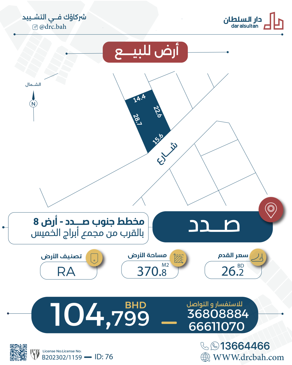 أرض سكنية للبيع في صدد بتصنيف RA (مناطق السكن الخاص - أ). مساحة أرض 370.8 متر مربع, بسعر 26.26د.ب لكل قدم مربع , السعر الإجمالي 104,799.302د.ب