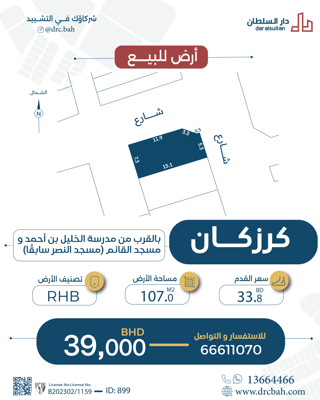 أرض سكنية للبيع في كرزكان بتصنيف RHB (مناطق السكن المتصل - ب). مساحة أرض 107 متر مربع, بسعر 33.86د.ب لكل قدم مربع , السعر الإجمالي 39,000.559د.ب