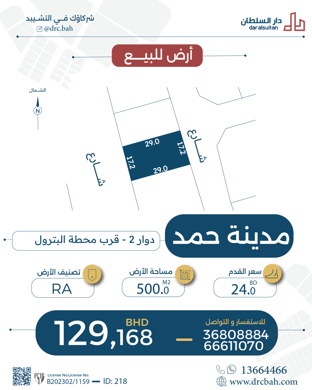 أرض سكنية للبيع في مدينة حمد بتصنيف RA (مناطق السكن الخاص - أ) تقع على شارعين (أمام و خلف). مساحة أرض 500 متر مربع, بسعر 25.00د.ب لكل قدم مربع , السعر الإجمالي 134,550.000د.ب