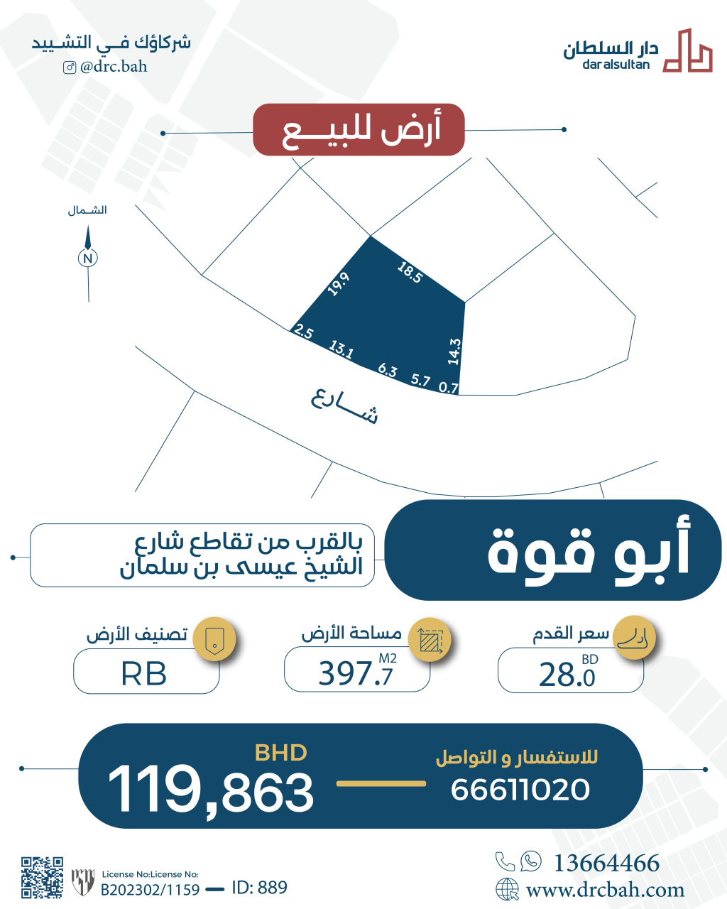 أرض سكنية للبيع في أبو قوة بتصنيف RB (مناطق السكن الخاص (ب)). مساحة أرض 397.7 متر مربع, بسعر 28.00د.ب لكل قدم مربع , السعر الإجمالي 119,863.520د.ب