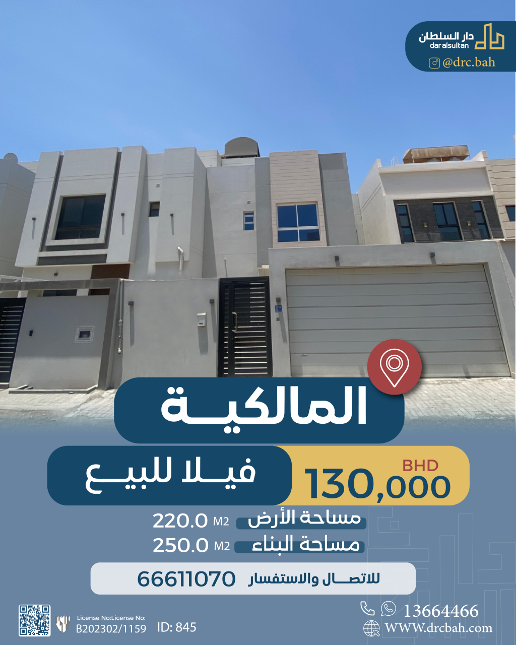 فيلا سكنية للبيع في المالكية. مساحة فيلا 220 متر مربع, مساحة البناء 250 متر مربع , السعر الإجمالي 130,000.000د.ب