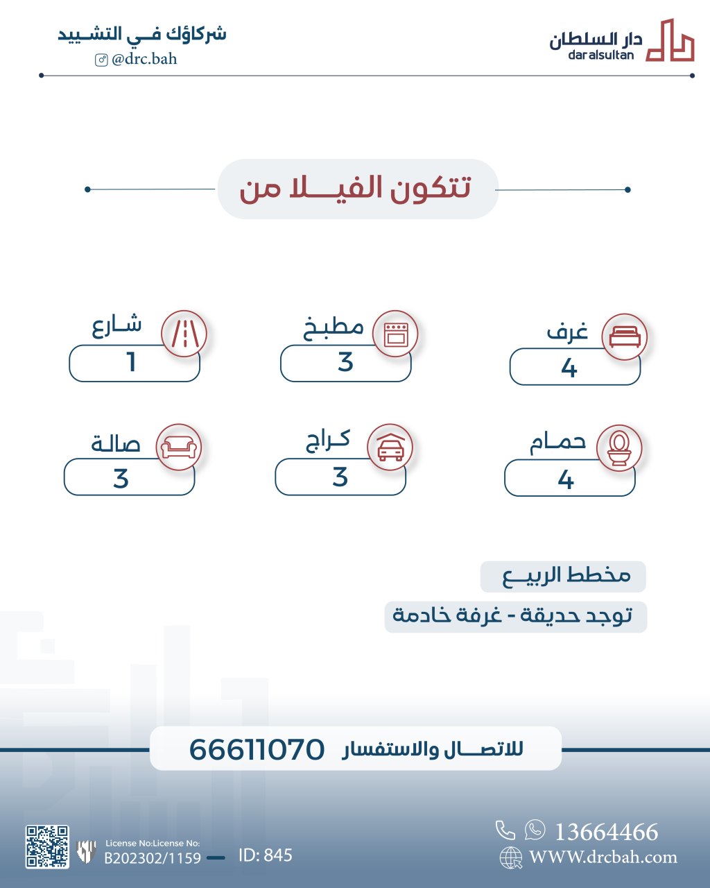 تتكون من: 4 غرف, 1 غرفة للخادمة, 4 حمامات, 2 الصالات, 2 مواقف السيارات