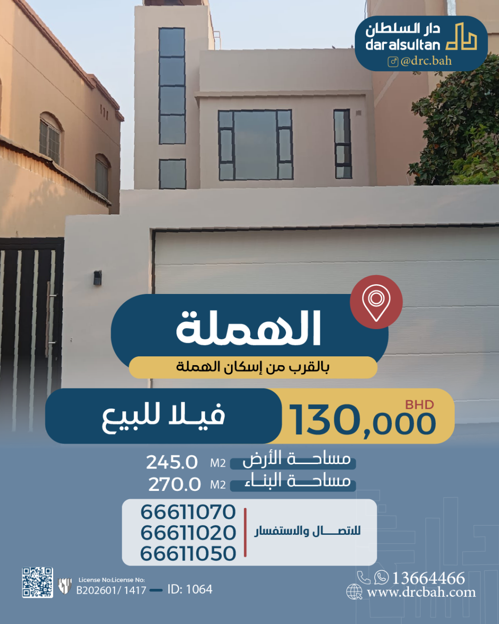 فيلا سكنية للبيع في الهملة. مساحة فيلا 245 متر مربع, مساحة البناء 270 متر مربع , السعر الإجمالي 130,000.000د.ب