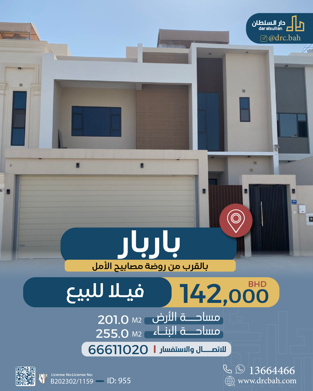 فيلا سكنية للبيع في باربار بتصنيف RA (مناطق السكن الخاص - أ) تقع على شارع واحد. مساحة فيلا 201 متر مربع, مساحة البناء 255 متر مربع , السعر الإجمالي 142,000.000د.ب , غير مفروش, حاله العقار جديد