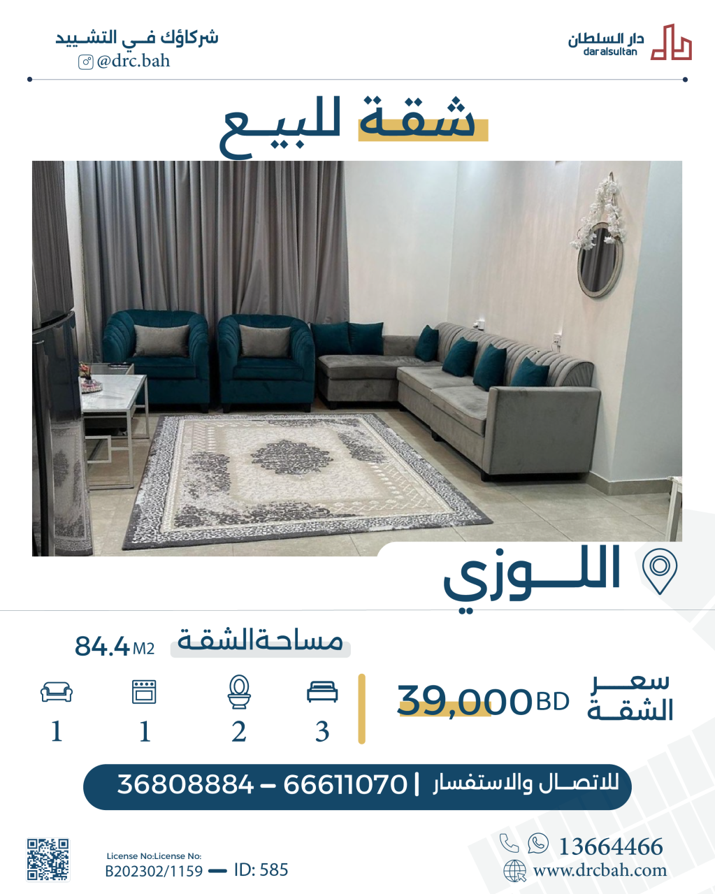 Residential Apartment for Sale in Lawzi. The Apartment size is 84.4 SQM, with a total price of 39,000.000BHD , Unfurnished