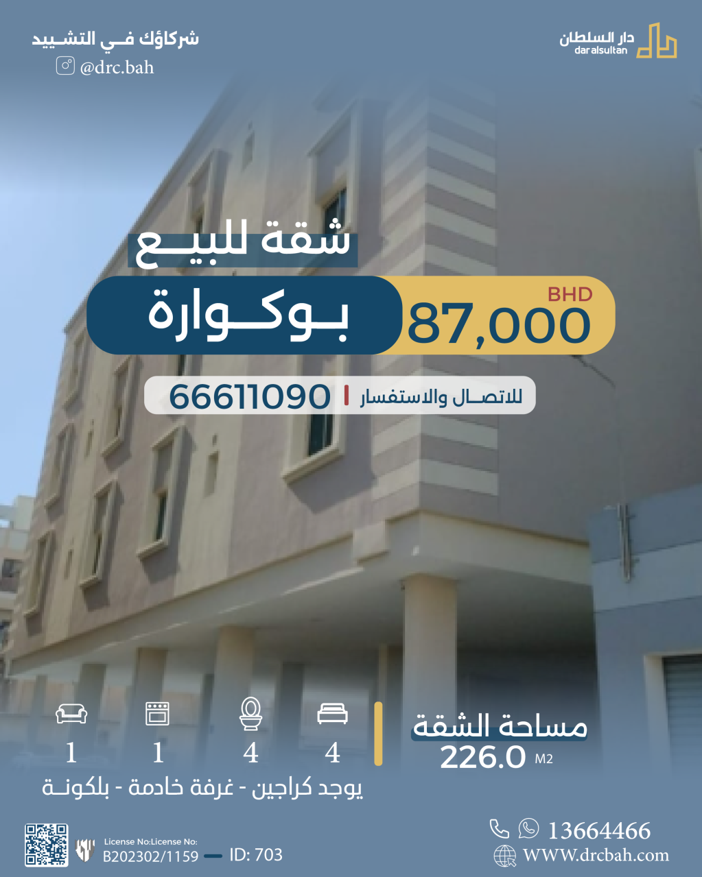 Residential Apartment for Sale in Rifaa. The Apartment size is 226 SQM, with a total price of 87,000.000BHD
