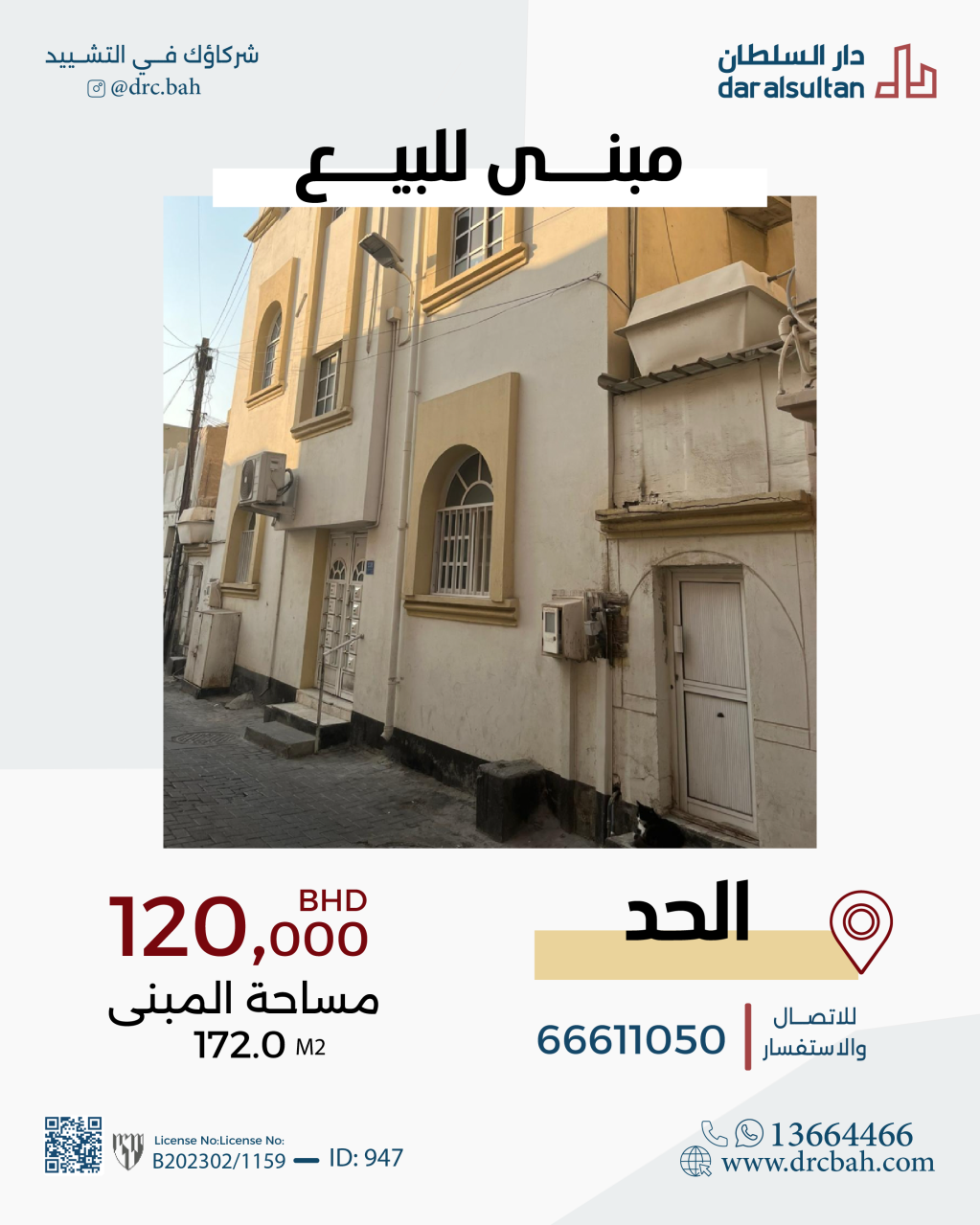 Residential Building for Sale in Hidd. The Building size is 172 SQM, with a total price of 120,000.000BHD