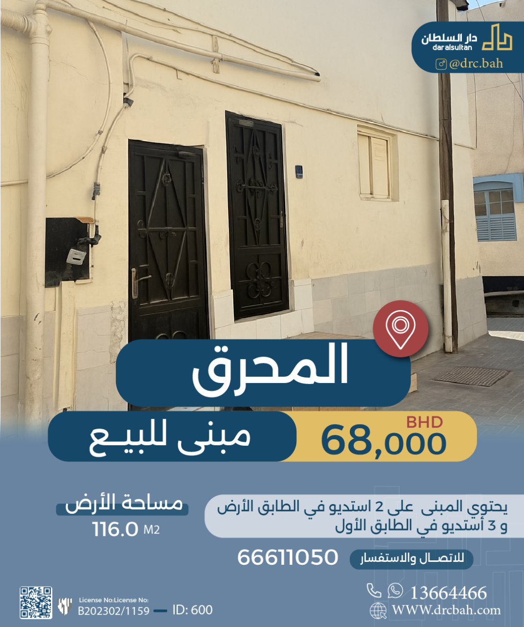 Residential Building for Sale in Muharraq. The Building size is 116 SQM, with a total price of 68,000.000BHD