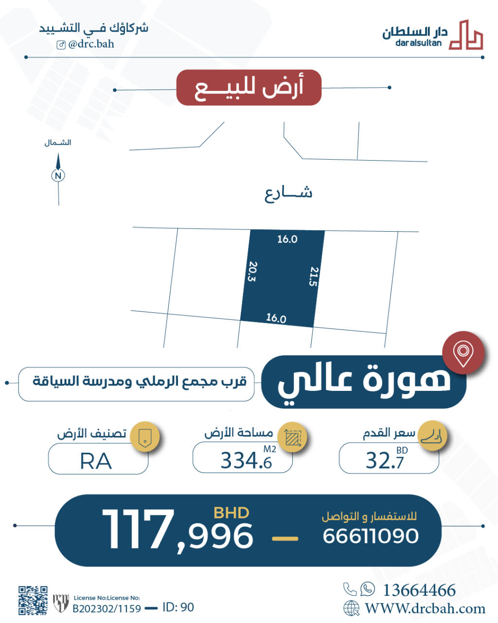 Residential Land for Sale in A'ali with a classification of RA (Private Residential Area - A) located on One Road. The Land size is 334.6 SQM, priced at 32.76BHD per SQFT , with a total price of 117,996.602BHD
