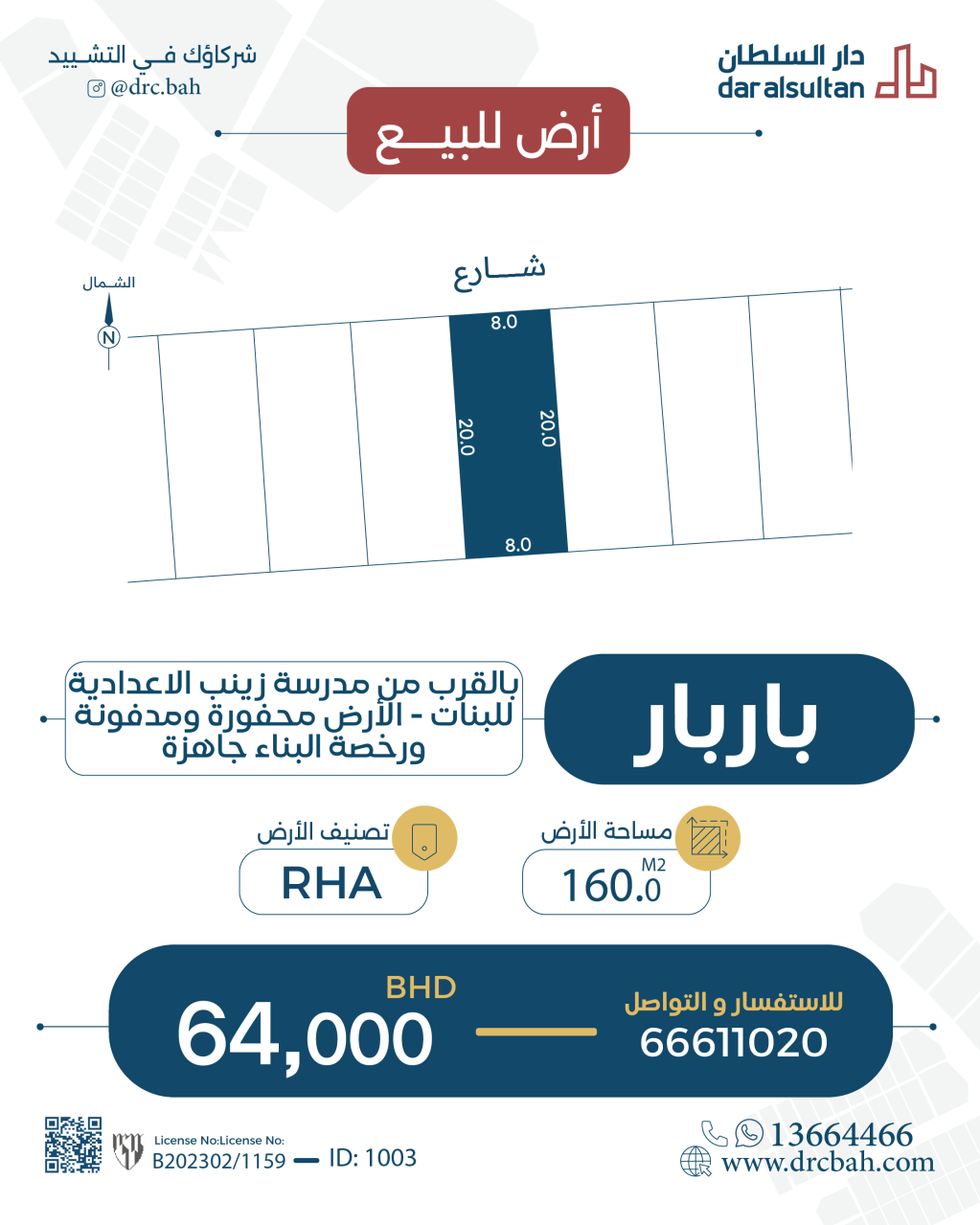 Residential Land for Sale in Barbar with a classification of RHA (Connected Residential Area – A) located on One Road. The Land size is 160 SQM, priced at 37.16BHD per SQFT , with a total price of 64,000.161BHD