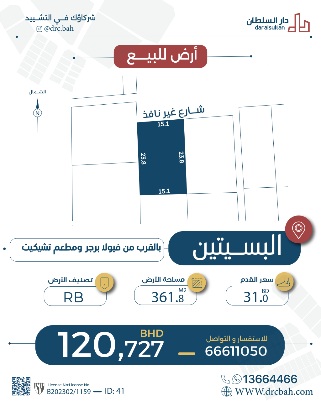 Residential Land for Sale in Busaiteen with a classification of RB (Private Residential Area - B). The Land size is 361.8 SQM, priced at 31.00BHD per SQFT , with a total price of 120,727.020BHD