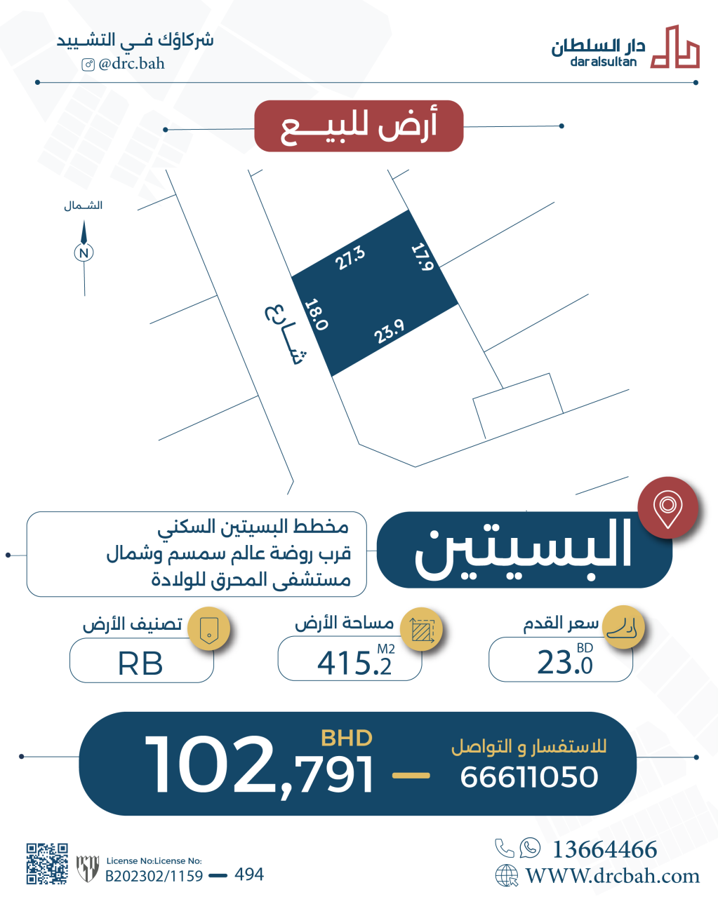 Residential Land for Sale in Busaiteen with a classification of RB (Private Residential Area - B). The Land size is 415.2 SQM, priced at 23.00BHD per SQFT , with a total price of 102,791.830BHD