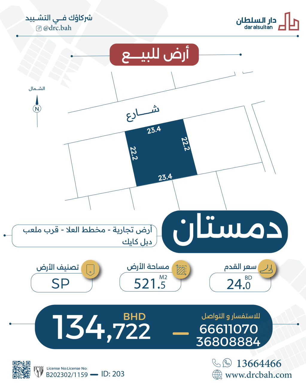 Residential Land for Sale in Dumistan with a classification of SP (Special Nature Projects Areas) located on One Road. The Land size is 521.5 SQM, priced at 24.00BHD per SQFT , with a total price of 134,722.320BHD