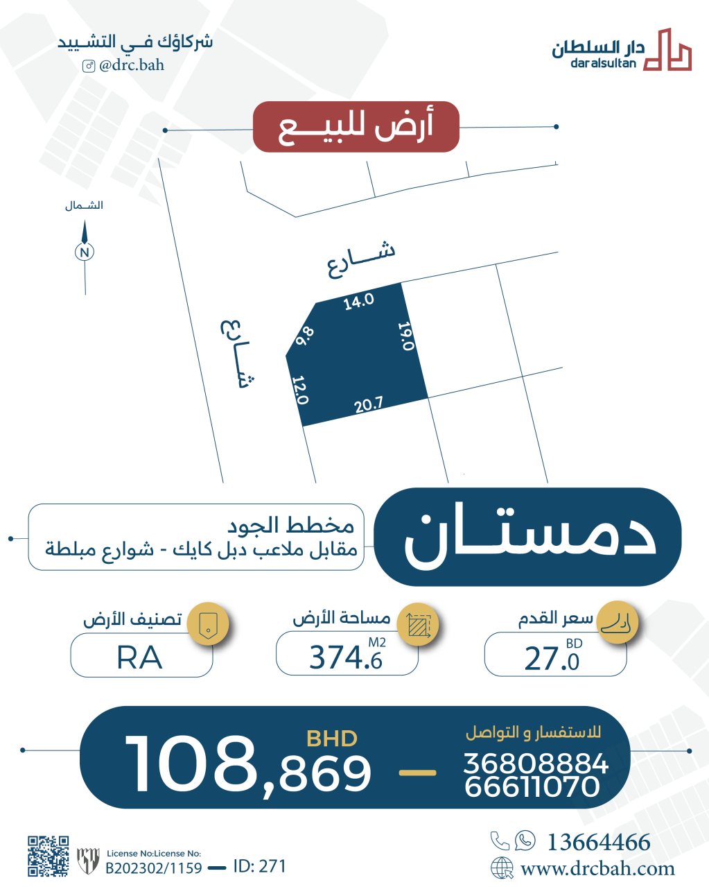 Residential Land for Sale in Dumistan with a classification of RA (Private Residential Area - A) located on Two Roads (Corner). The Land size is 374.6 SQM, priced at 27.00BHD per SQFT , with a total price of 108,869.130BHD