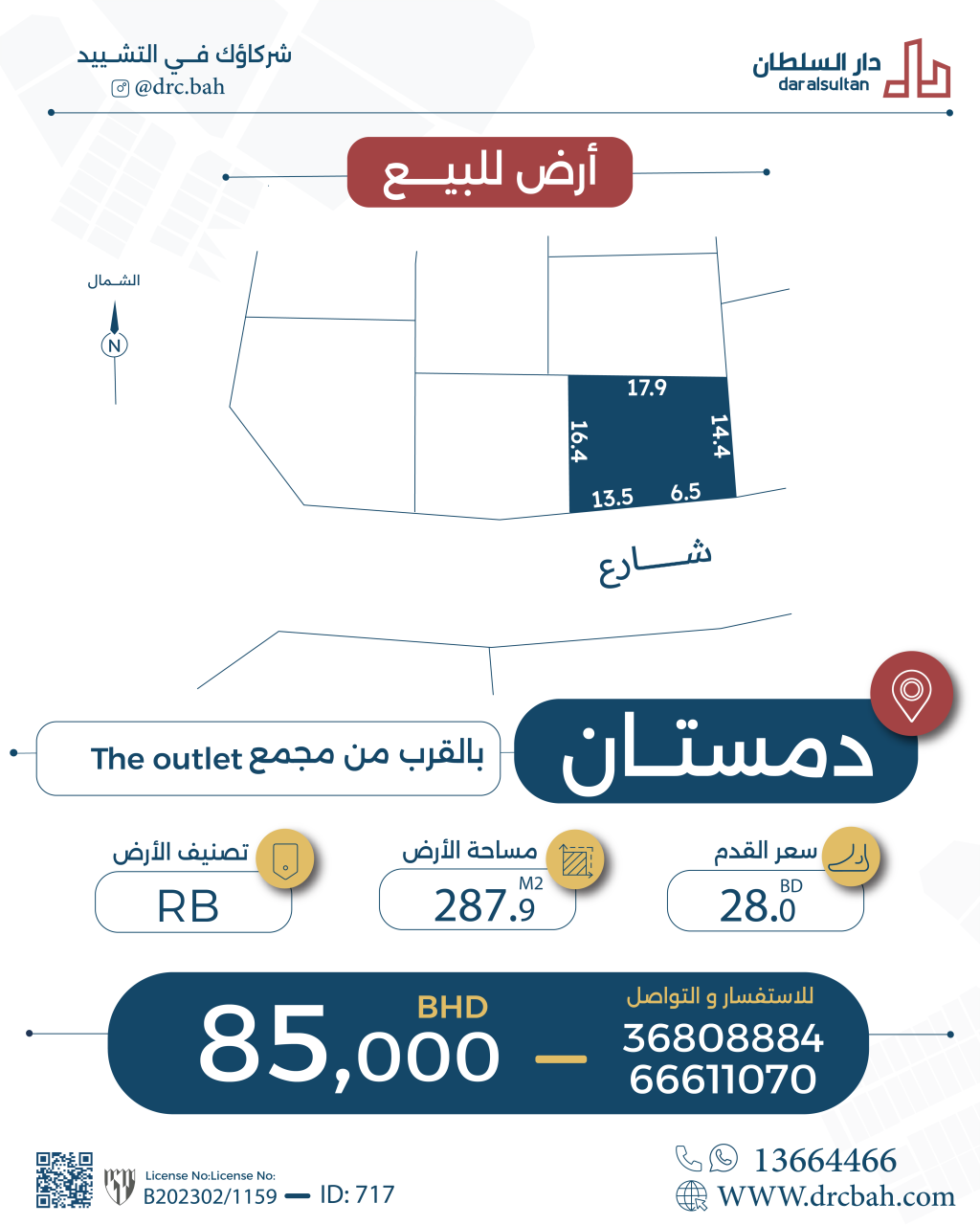 Residential Land for Sale in Dumistan with a classification of RB (Private Residential Area - B). The Land size is 287.9 SQM, priced at 28.07BHD per SQFT , with a total price of 87,000.203BHD