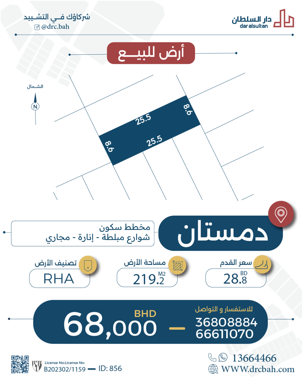 Residential Land for Sale in Dumistan with a classification of RHA (Connected Residential Area – A). The Land size is 219.2 SQM, priced at 28.82BHD per SQFT , with a total price of 68,002.285BHD