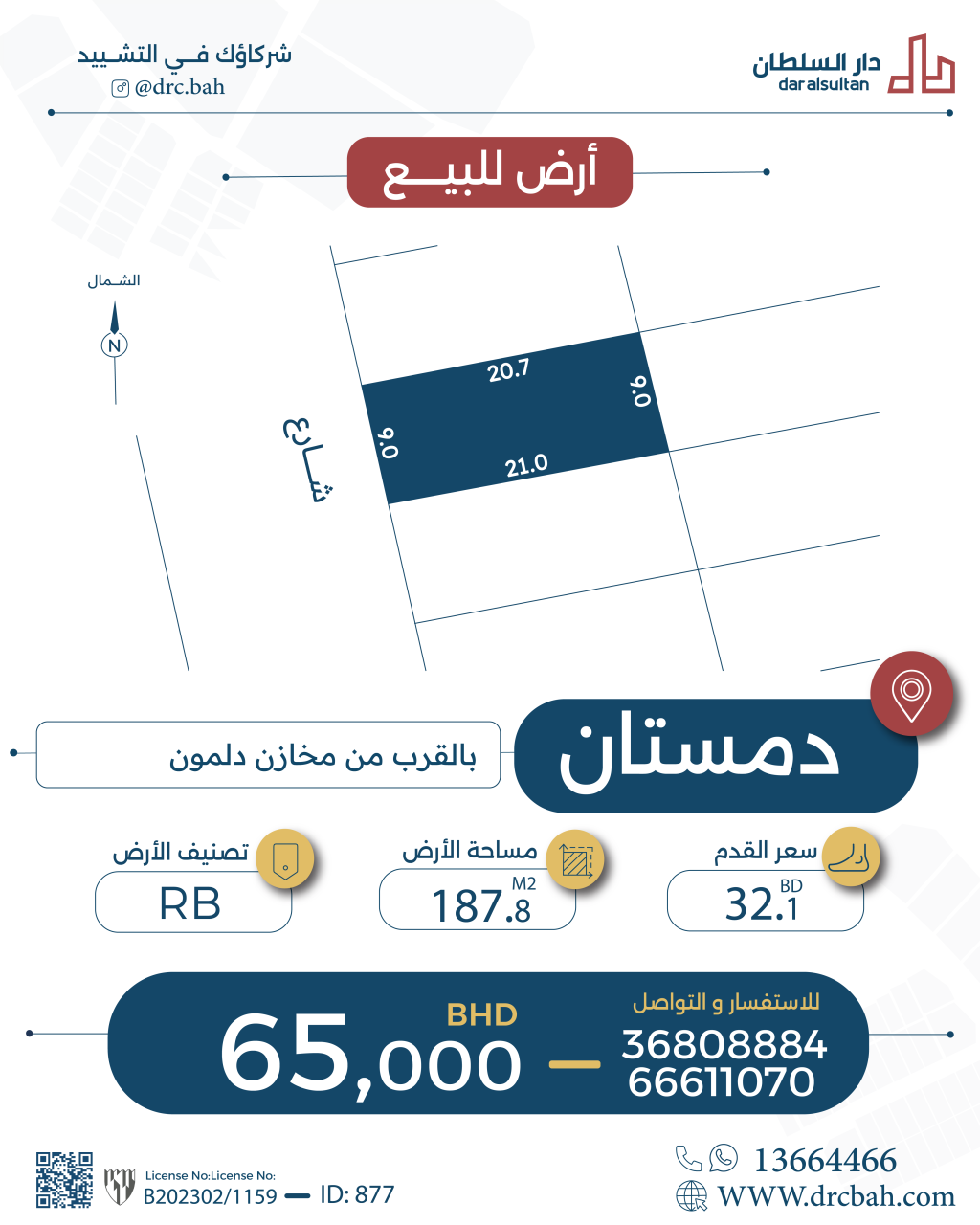 Residential Land for Sale in Dumistan with a classification of RB (Private Residential Area - B). The Land size is 187.8 SQM, priced at 32.16BHD per SQFT , with a total price of 65,000.689BHD