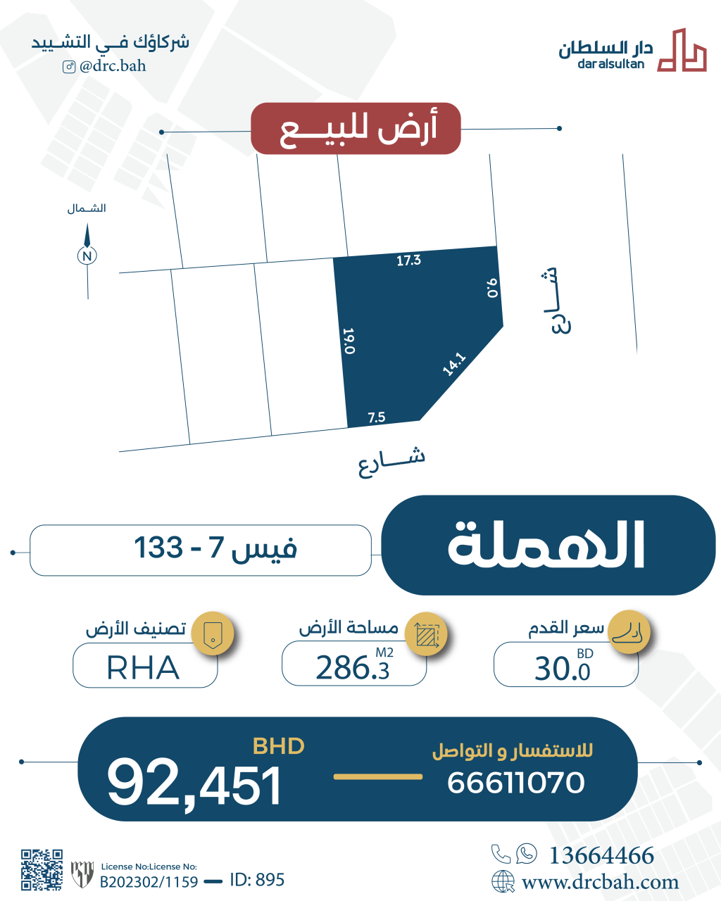 Residential Land for Sale in Hamalah with a classification of RHA (Connected Residential Area – A). The Land size is 286.3 SQM, priced at 30.00BHD per SQFT , with a total price of 92,451.900BHD