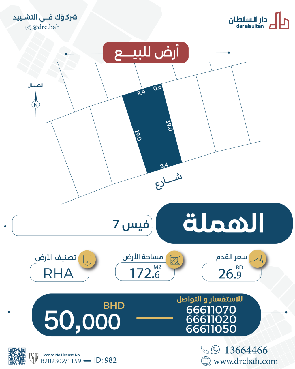 Residential Land for Sale in Hamalah with a classification of RHA (Connected Residential Area – A). The Land size is 172.6 SQM, priced at 26.91BHD per SQFT , with a total price of 50,000.855BHD