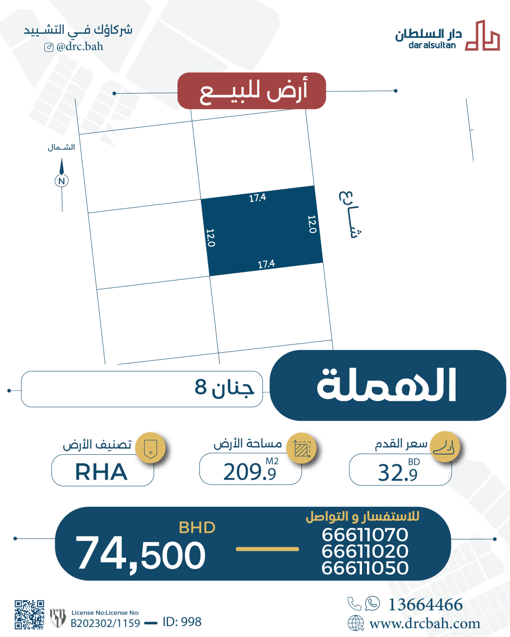 Residential Land for Sale in Hamalah with a classification of RHA (Connected Residential Area – A). The Land size is 209.90 SQM, priced at 32.97BHD per SQFT , with a total price of 74,500.137BHD