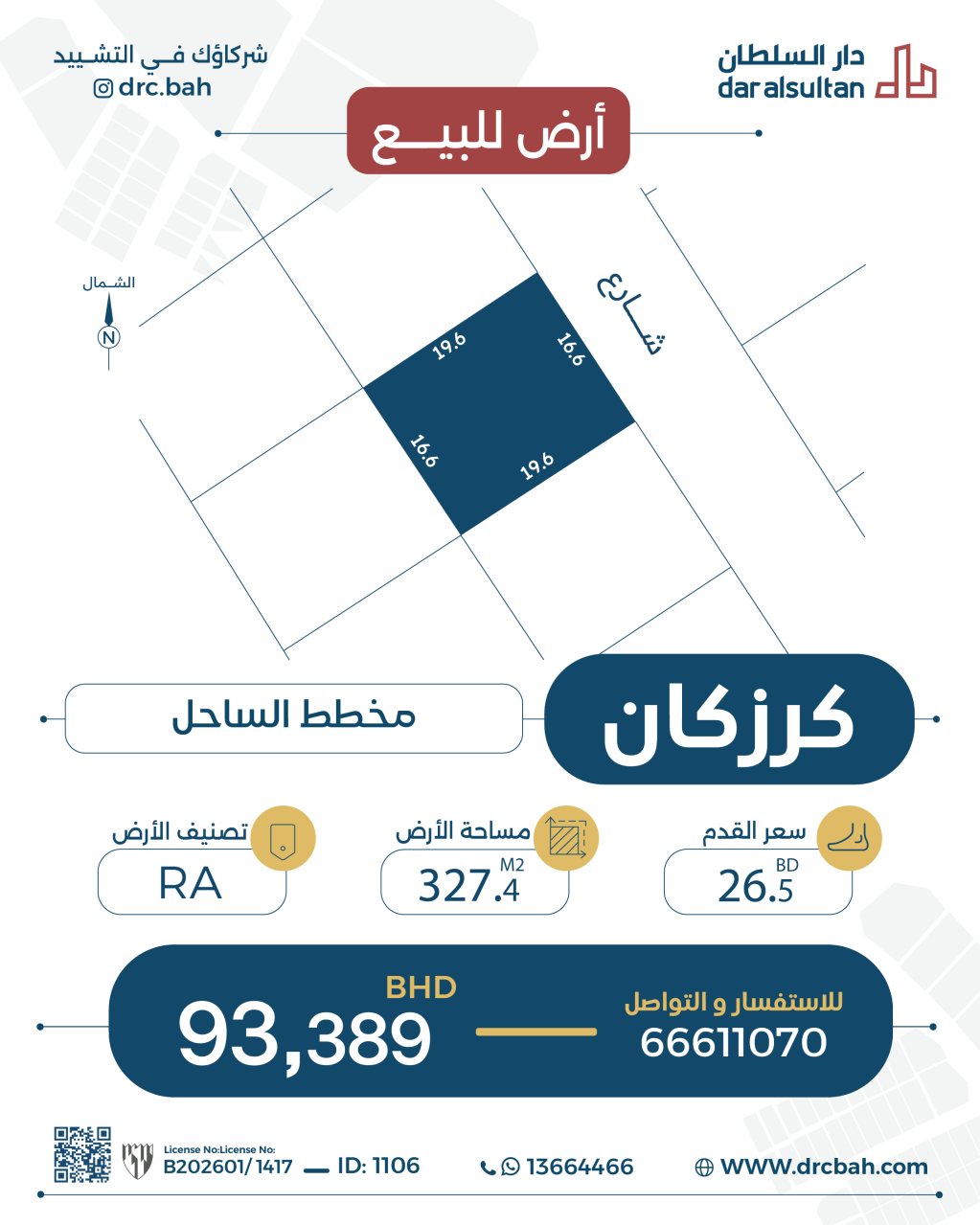 Residential Land for Sale in Karzakan with a classification of RA (Private Residential Area - A). The Land size is 327.4 SQM, priced at 26.50BHD per SQFT , with a total price of 93,389.445BHD