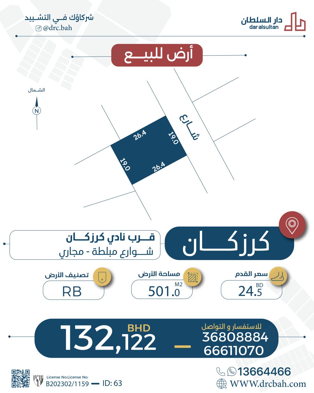 Residential Land for Sale in Karzakan with a classification of RB (Private Residential Area - B) located on One Road. The Land size is 501 SQM, priced at 28.00BHD per SQFT , with a total price of 150,997.280BHD