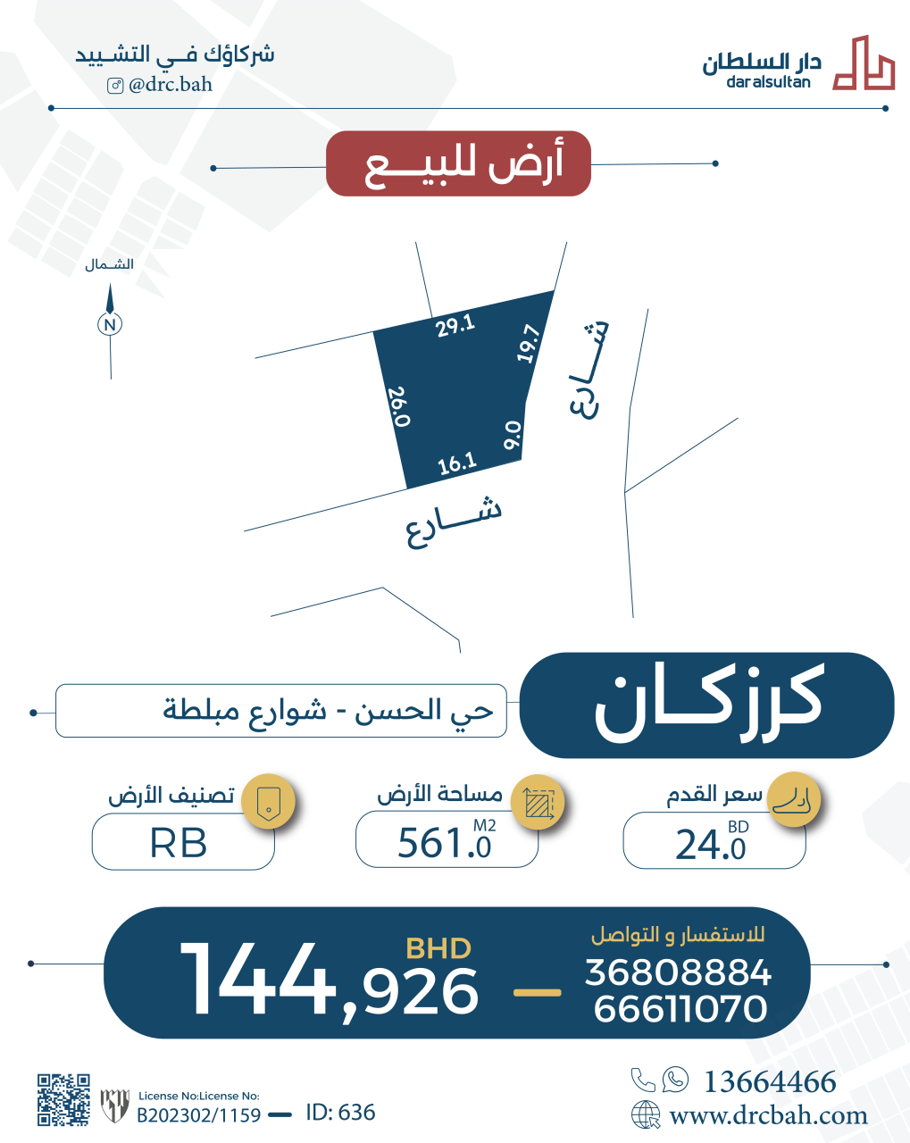 Residential Land for Sale in Karzakan with a classification of RB (Private Residential Area - B). The Land size is 561 SQM, priced at 24.00BHD per SQFT , with a total price of 144,926.400BHD