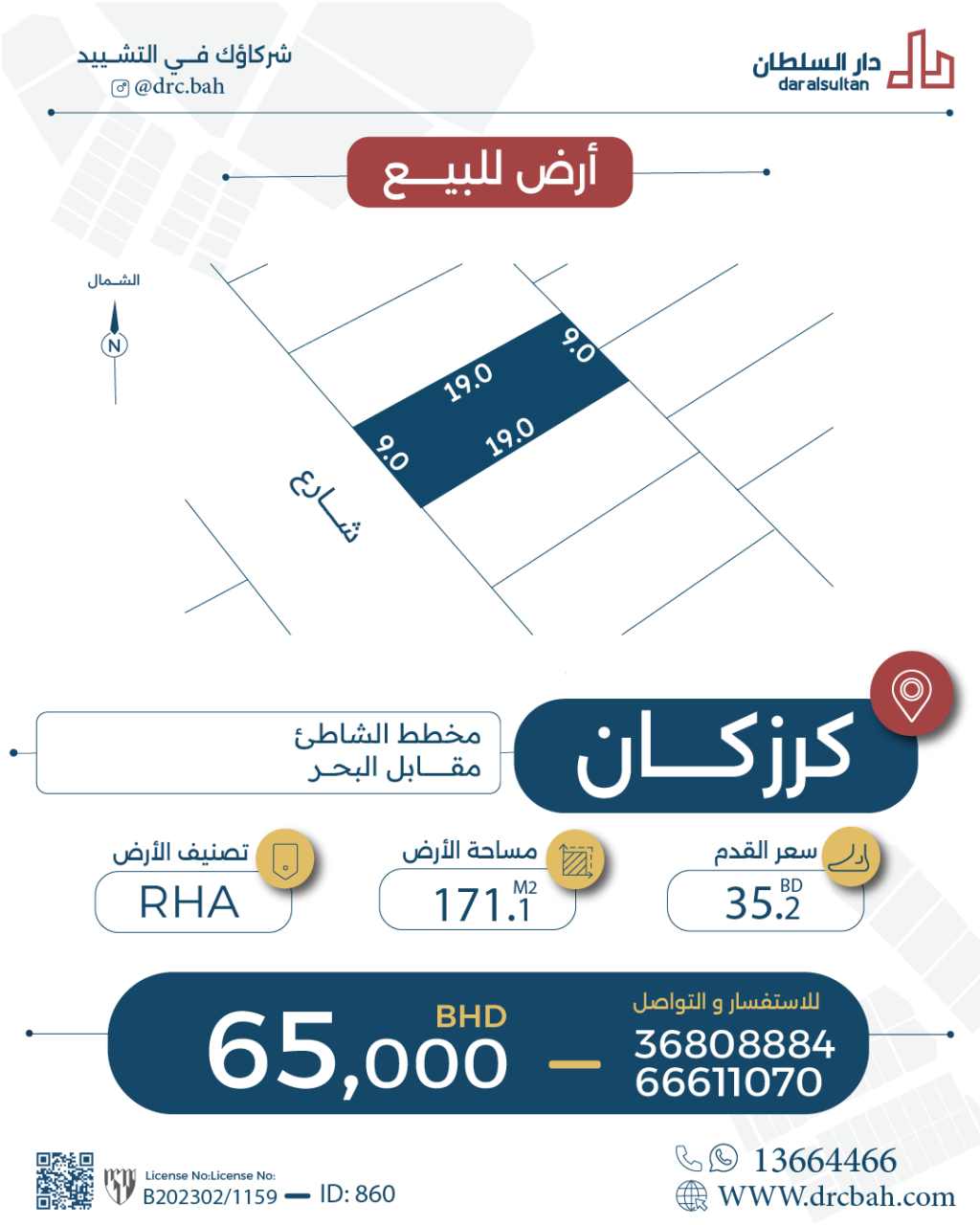 Residential Land for Sale in Karzakan with a classification of RHA (Connected Residential Area – A). The Land size is 171.1 SQM, priced at 35.29BHD per SQFT , with a total price of 65,001.666BHD