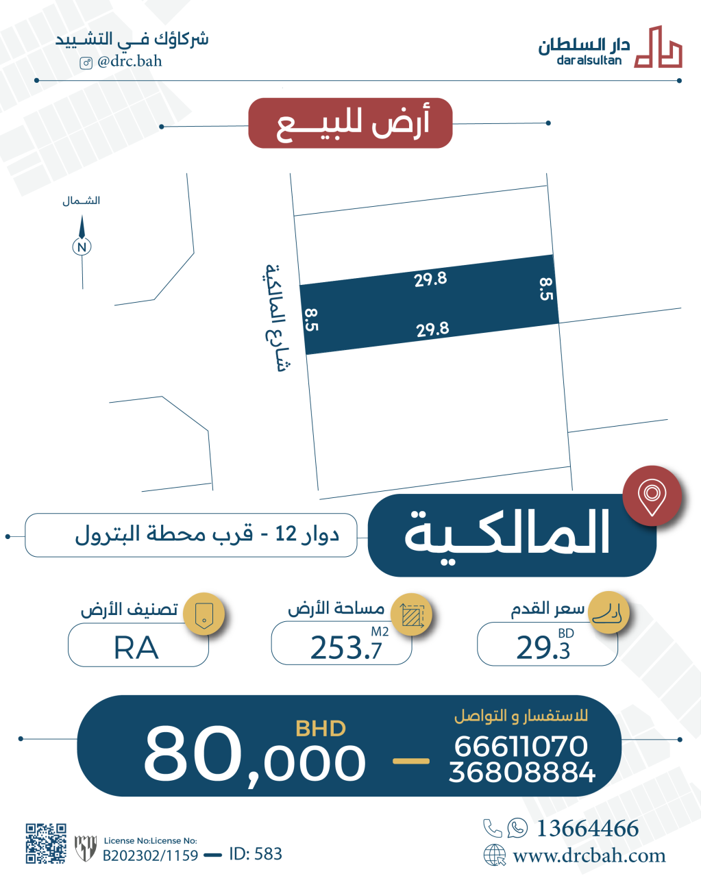 Residential Land for Sale in Malkiya with a classification of RA (Private Residential Area - A). The Land size is 253.7 SQM, priced at 29.30BHD per SQFT , with a total price of 80,013.319BHD